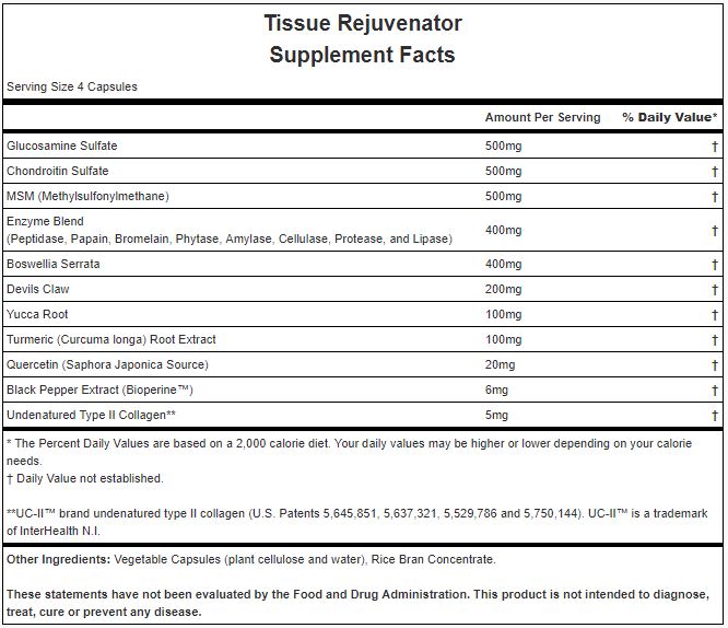 Tissue Rejuvenator là một công thức mạnh mẽ giúp xây dựng lại khớp, gân và mô mềm, đồng thời giảm sưng và giảm đau. Trong khi việc xây dựng lại các mô bị hư hỏng hoặc thoái hóa sẽ mất thời gian, các khía cạnh giảm đau của Mô trẻ hóa đi làm ngay lập tức. Do đó, nó cũng phù hợp như nhau để đối phó với các cơn đau cấp tính, bong gân, hoặc các tình trạng mãn tính và thoái hóa. Mô trẻ hóa là sự thay thế lành mạnh của bạn đối với NSAID (thuốc chống viêm không steroid), giúp giảm đau nhanh chóng, với kết quả cải thiện khi bạn luôn sử dụng sản phẩm.